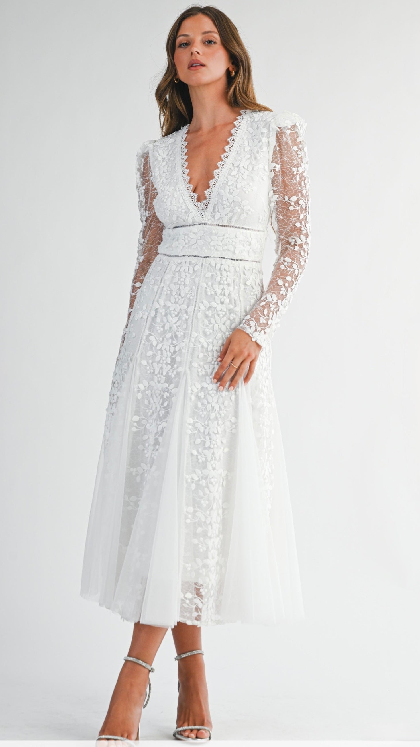 Expertly crafted with delicate lace, the Bianko dress features a flattering V-neck and long sleeves. This elegant white dress is perfect for any occasion, adding a touch of sophistication and style to your wardrobe. Made with high-quality materials, it is comfortable and luxurious to wear.