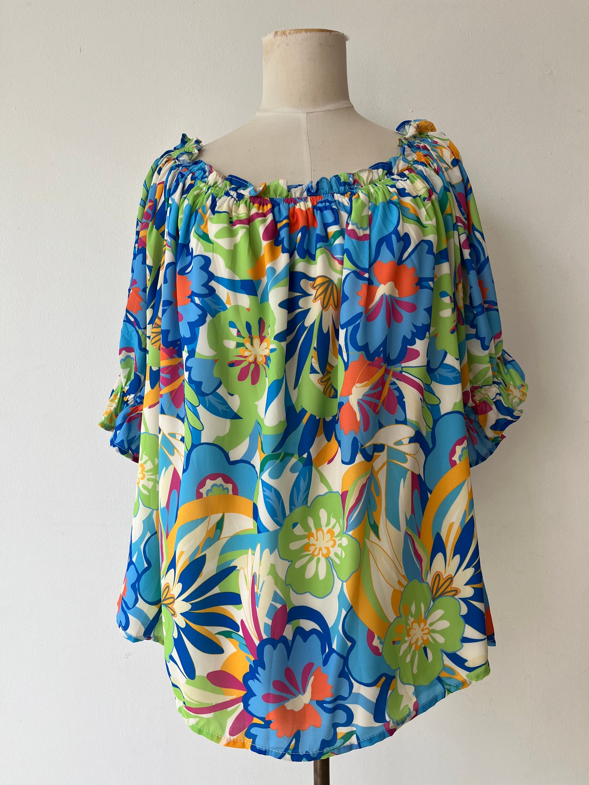 The Brittany Top features an off-shoulder design complemented by a floral pattern. This combination provides a stylish, breathable option suitable for warm weather. The design allows for ease of movement, while the floral motif adds a touch of elegance, enhancing the overall aesthetic appeal of the garment.
