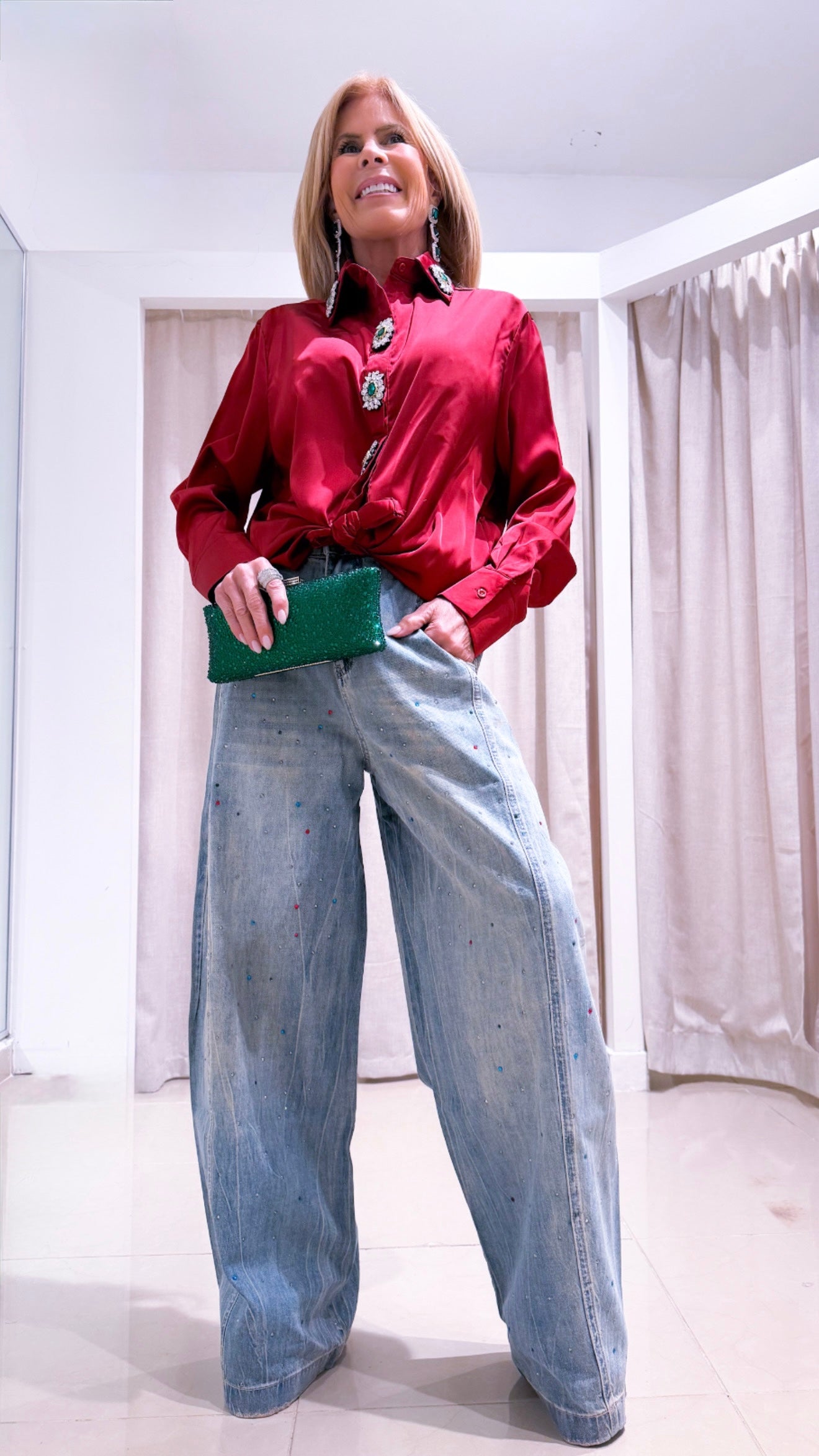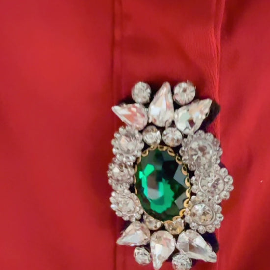The Claudia top is a professional and elegant choice, available in a deep vino color and accented with stunning rhinestone details. Expertly crafted and designed, this top adds a touch of glamour to any outfit. Elevate your wardrobe with this statement piece.