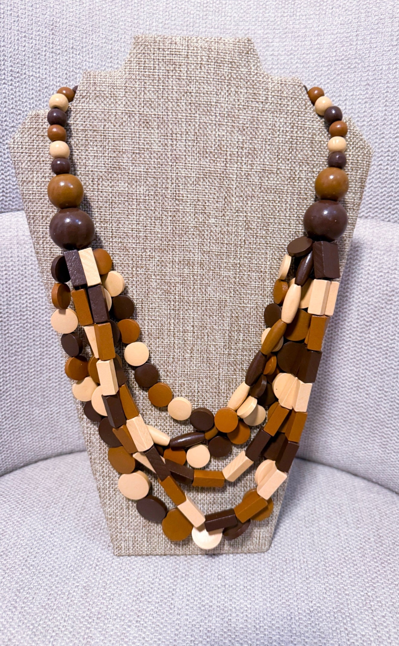 Expertly crafted, the Claudine necklace features a unique blend of wooden tones and layered design. Elevate any look with this one-of-a-kind collar, perfect for adding depth and texture to your outfit. A must-have for any fashion-forward individual.