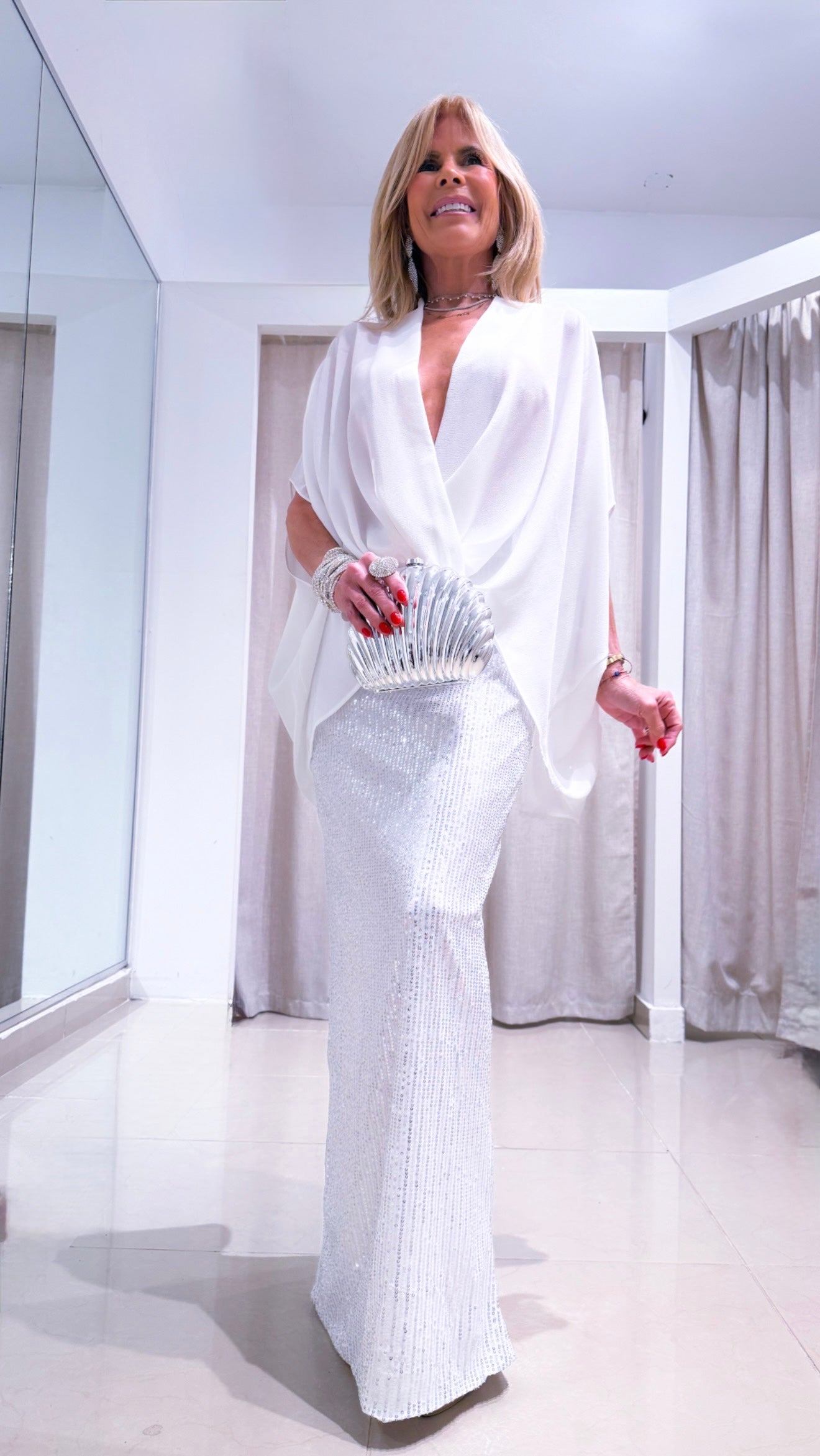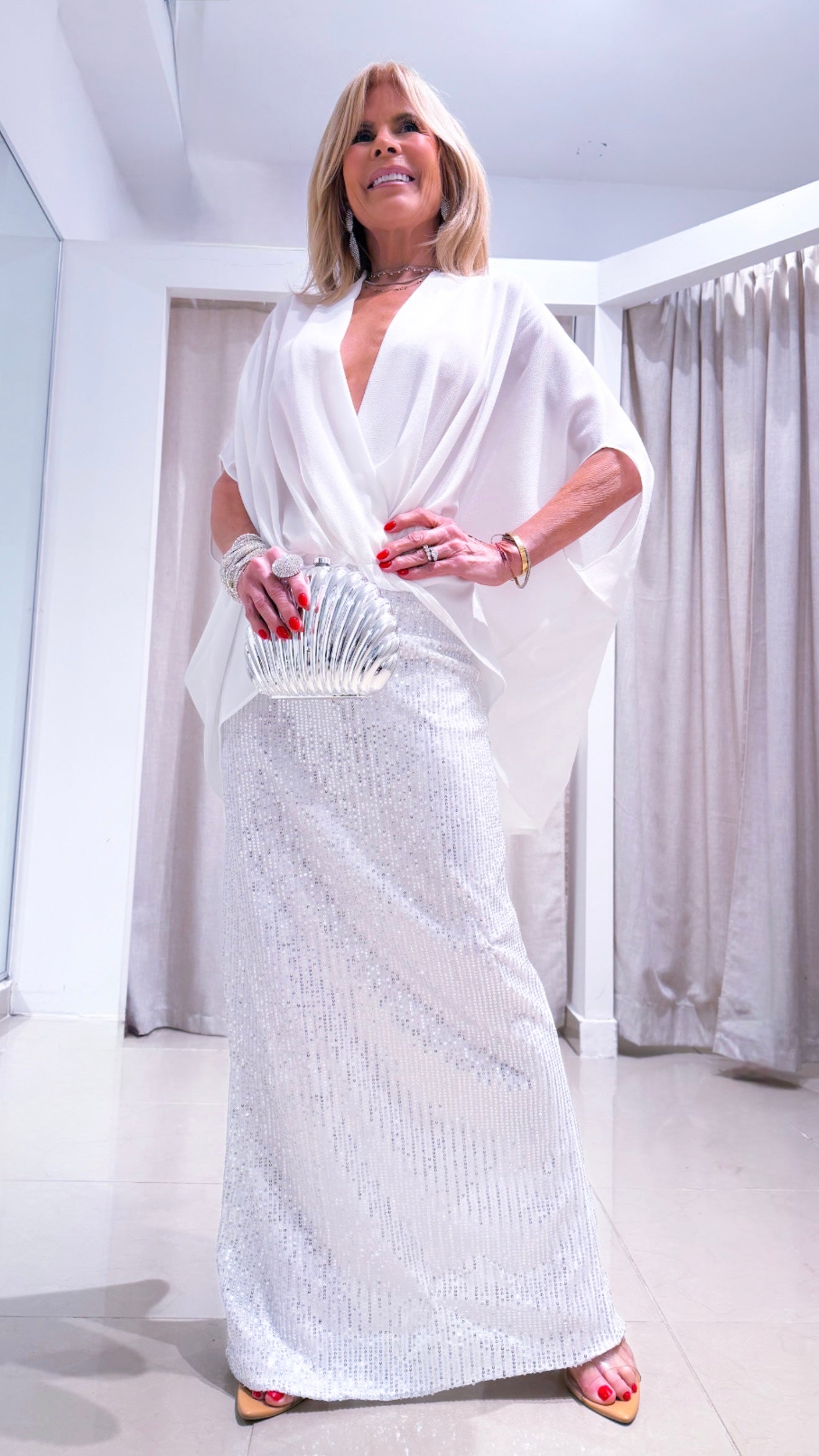 The Daniela skirt is a white skirt with sparkling silver sequins, adding a touch of glamour to any outfit. The sequins reflect light, creating a dazzling effect. Perfect for special occasions or dressing up any ensemble. Light up your wardrobe with the Daniela skirt.