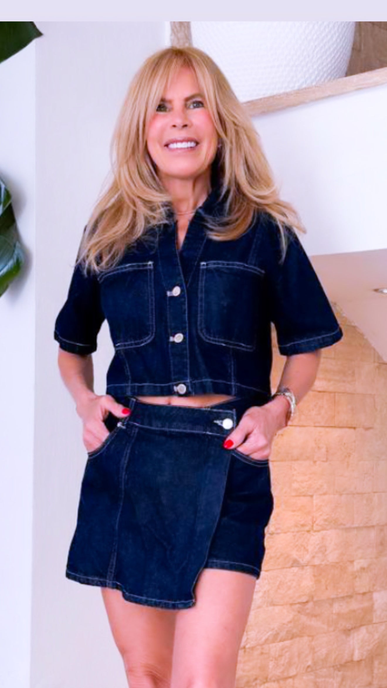 Discover the versatile and stylish Emille set. This set includes a skirt, pant, and crop top with silver button accents. Perfect for various occasions, each piece can be mixed and matched with other items in your wardrobe. Elevate your look with this chic and functional set.