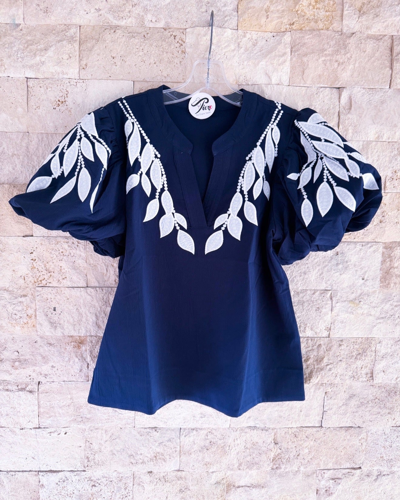 Stay stylish with the Eiffel top in navy with white leaf details and elastic sleeves. Designed for comfort and versatility, this top is perfect for any occasion. Made with high quality materials, it's sure to become a staple in your wardrobe. Elevate your look with this must-have piece.