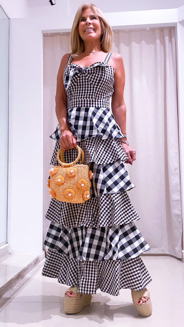 This gingham dress features multiple tiers on the skirt and a classic black and white checkered print. The layered design adds depth and movement to your outfit. A versatile dress that can easily transition from day to night.