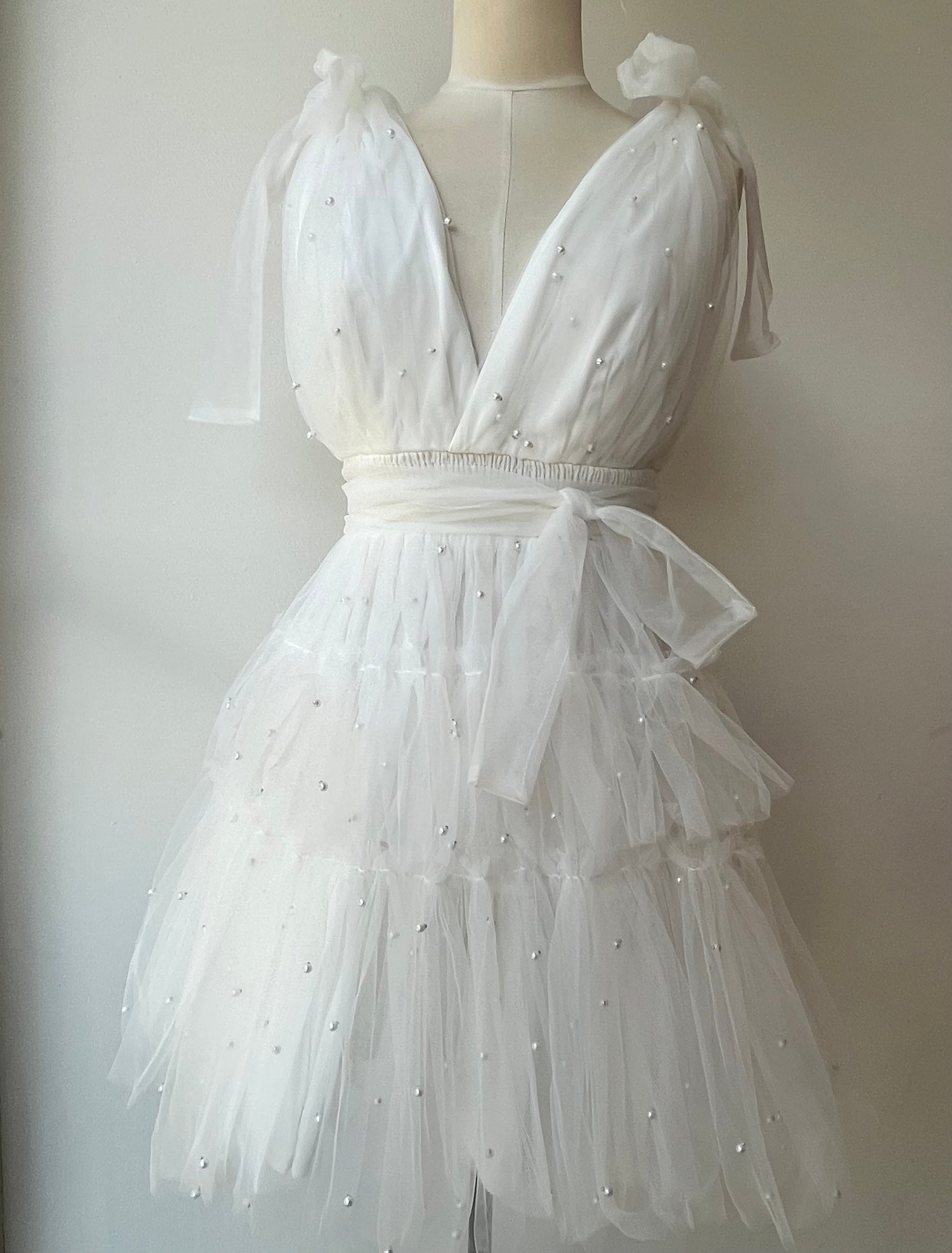 The Ginnie dress is a versatile must-have for any fashion-forward individual. Featuring a unique design and elegant pearl detailing, this dress is perfect for any event, day or night. Elevate your wardrobe with this stylish piece.