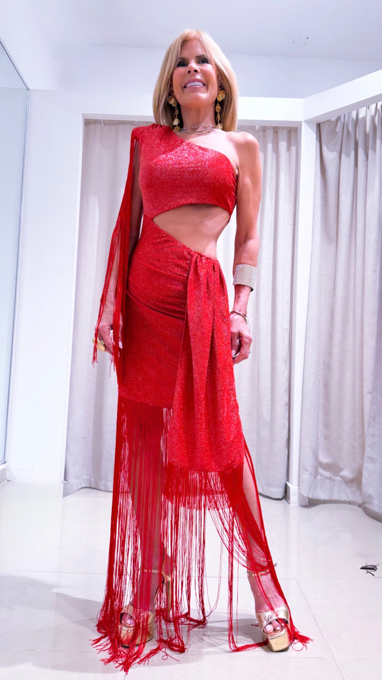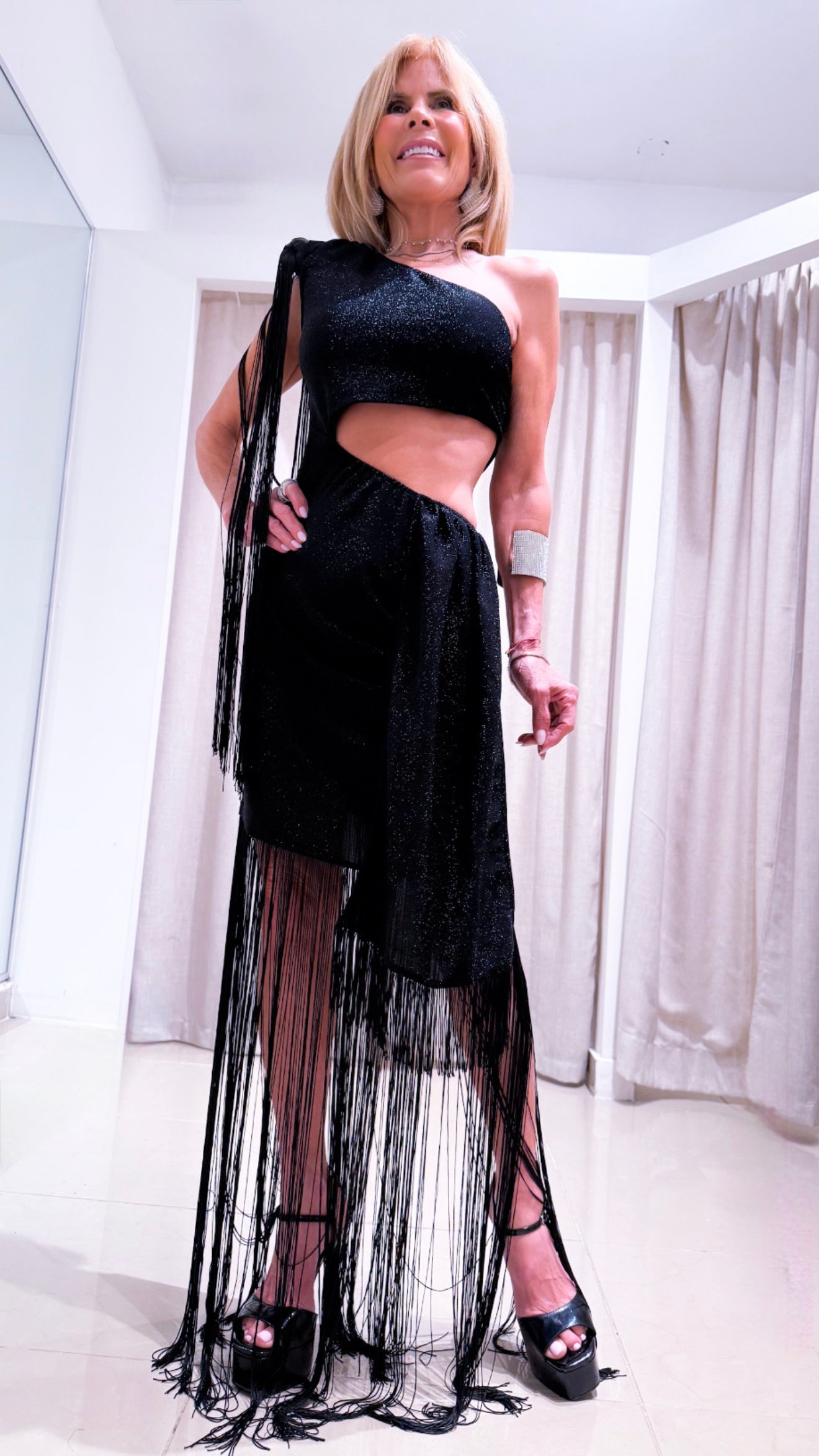 The Imelda dress features a fringe-trimmed cut-out design that adds a touch of glamour to any occasion. The fabric has a subtle shimmer, and the fringe detailing on the sleeves creates a playful movement. Perfect for making a statement and turning heads.