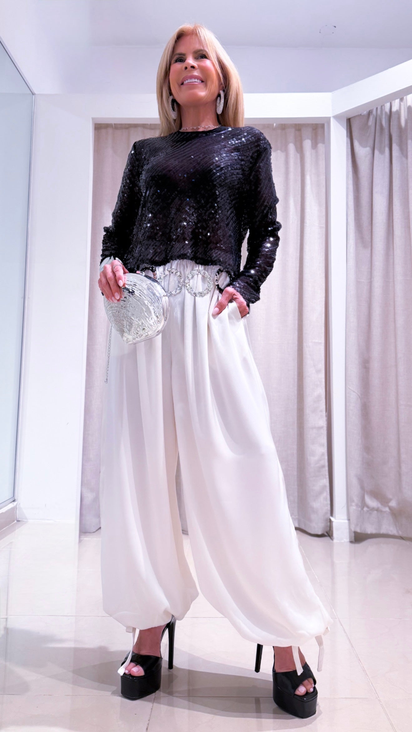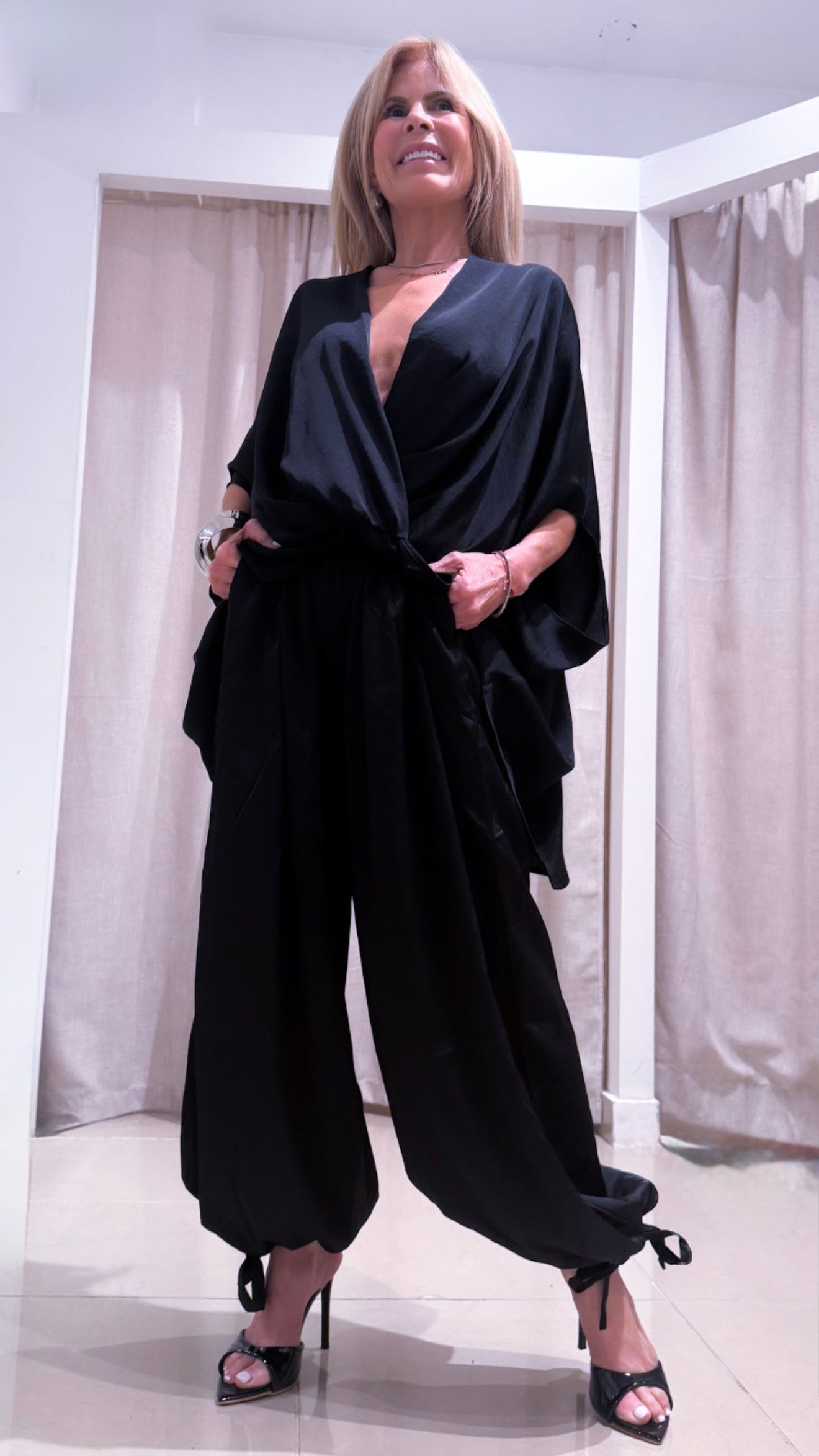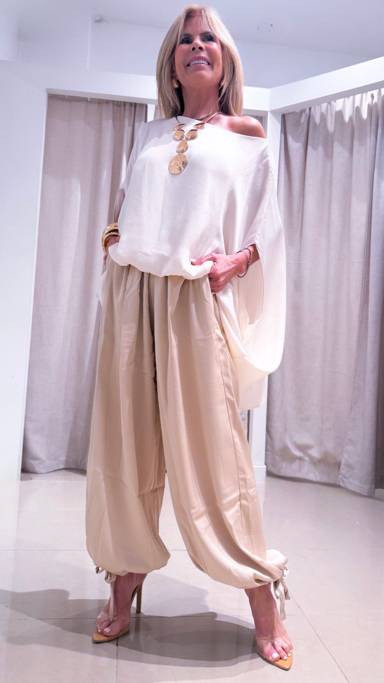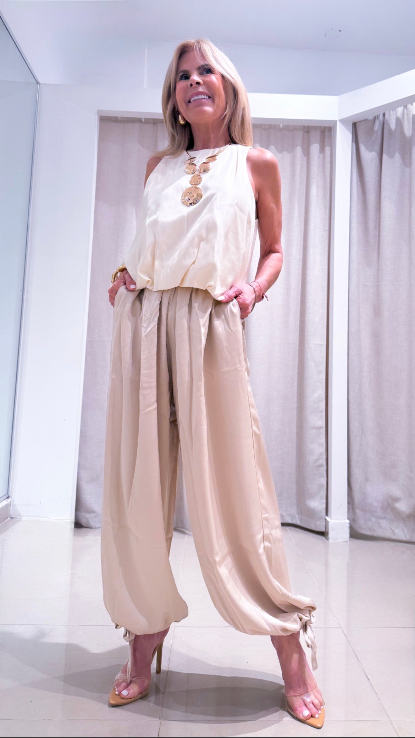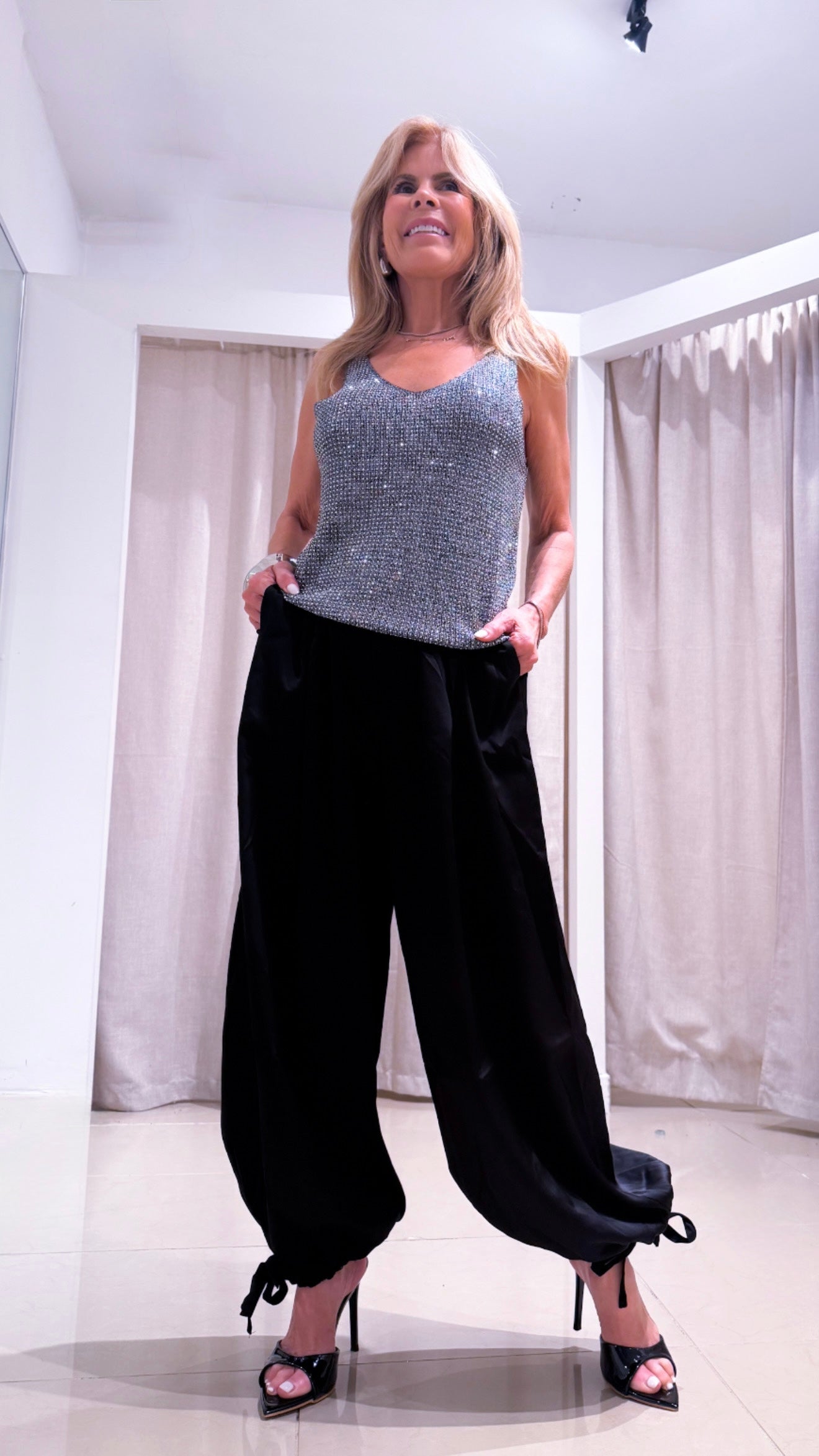 Expertly crafted with an elastic waist and satin fabric, the Jenna pant offers both comfort and style. Its harem style provides a flattering fit while the pockets add convenience. Perfect for effortless yet chic looks.