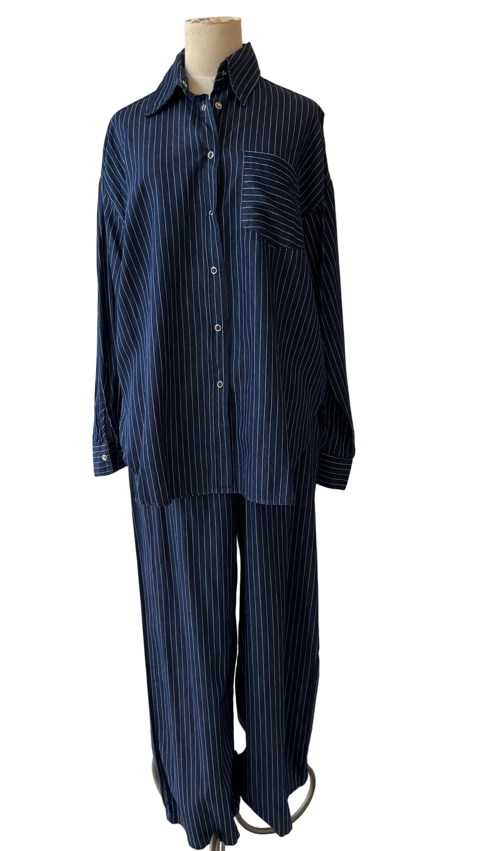 Enhance your wardrobe with the Lourdes set. This stylish set includes navy blue pants with white stripes, perfect for both casual and elegant occasions. Made with high-quality materials, the Lourdes set offers comfort and a touch of sophistication to elevate any outfit.Set