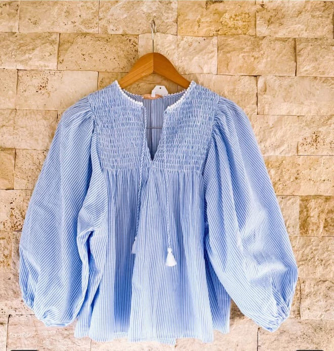Upgrade your wardrobe with the Marina top. This top features a loose fit with bubble sleeves and a delicate tie to cinch at the neck. The stylish stripes add a touch of sophistication. Perfect for any occasion.