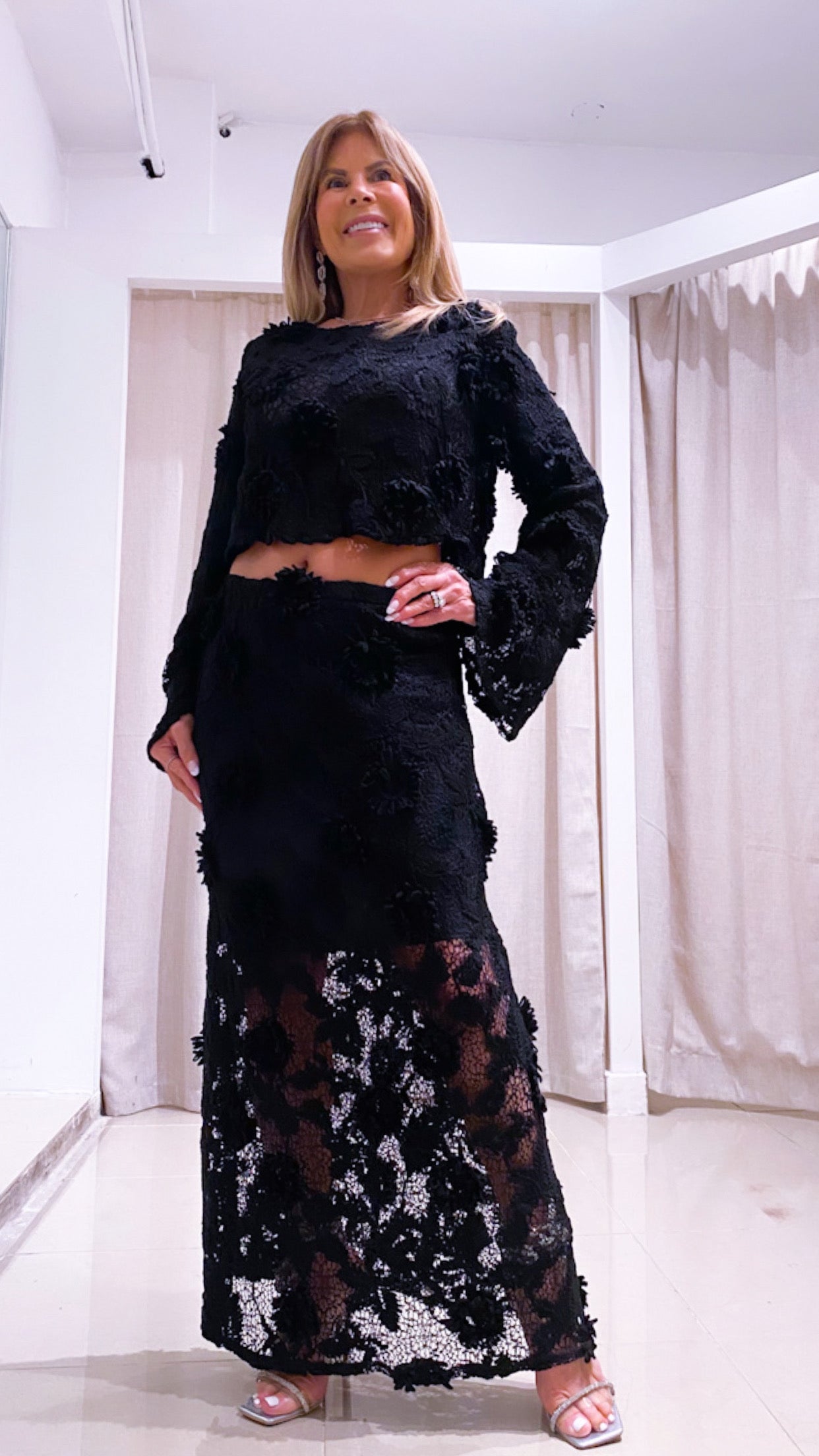 This lovely set featuring lace embellished with roses is perfect for any occasion. The delicate design adds a touch of elegance and beauty to any outfit. Enhance your wardrobe with this versatile and sophisticated addition.