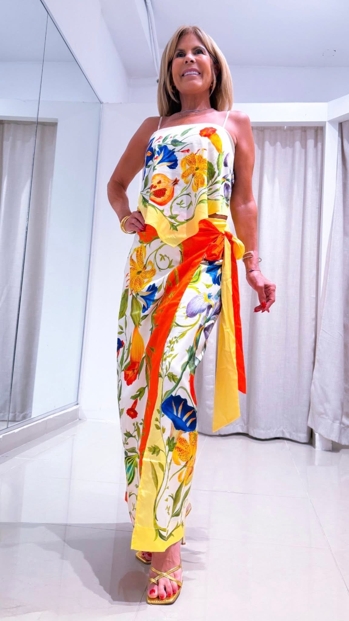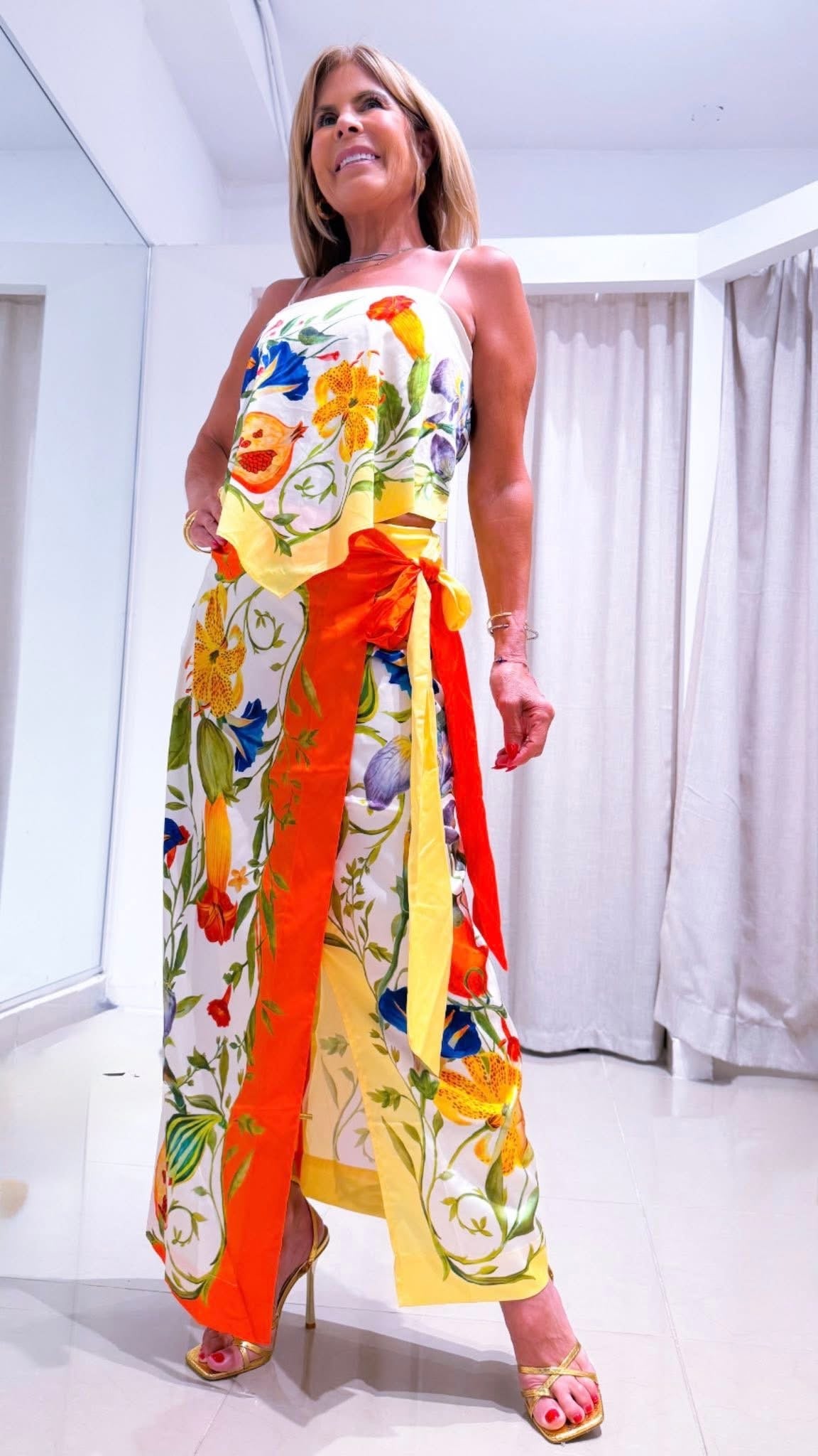 This Solei set includes a vibrant tropical-print skirt, perfect for adding a pop of color to any summer outfit. Made with a variety of eye-catching patterns, this set is sure to turn heads. Embrace the warm weather with this playful and stylish ensemble.