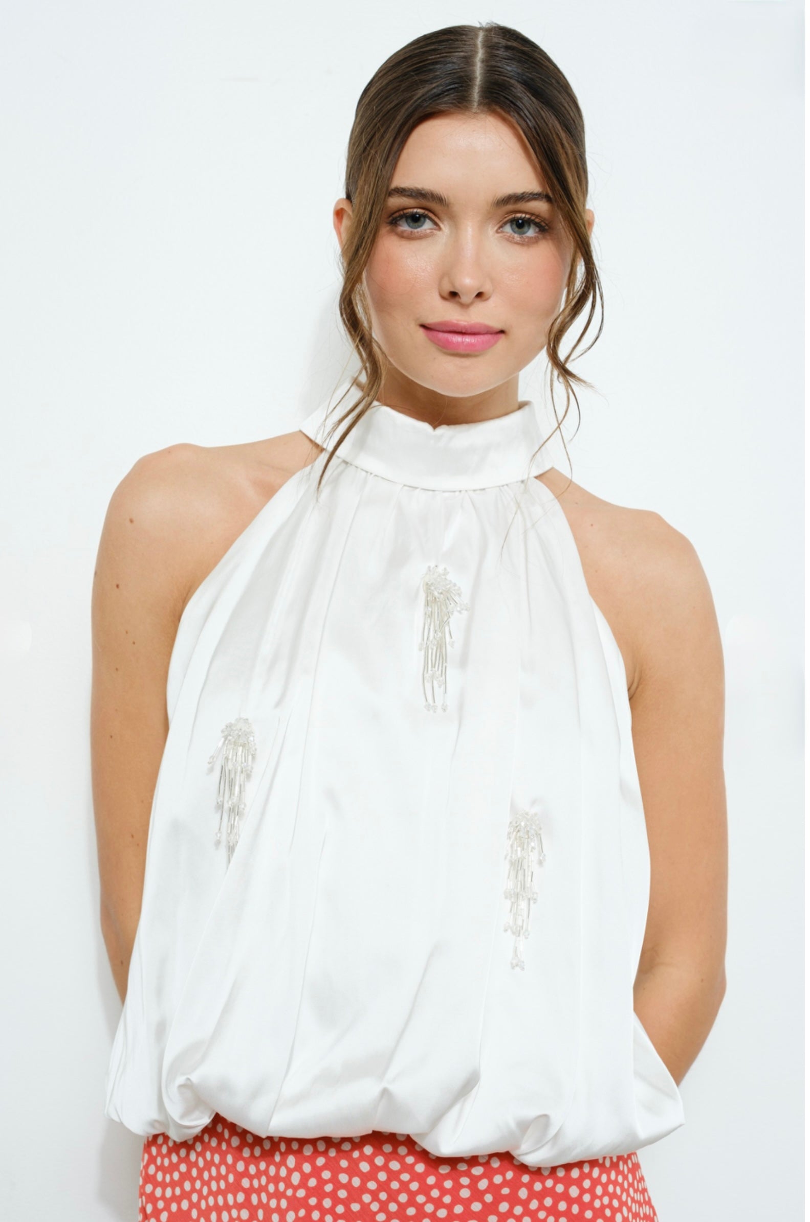 Introducing the Stefanie top - a sleeveless halter top adorned with shimmering sequins, cascading down in intricate designs. With no sleeves to restrict movement, this top is perfect for making a statement while staying comfortable. Elevate your look with this stylish and eye-catching piece.